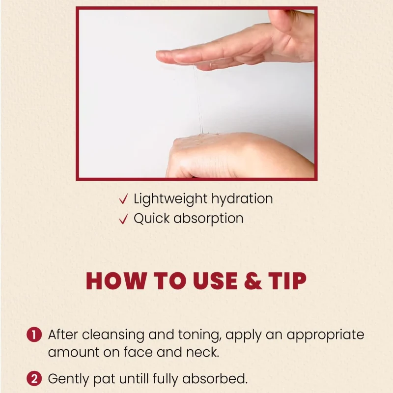 Après avoir nettoyé et tonifié votre peau, appliquez une quantité modérée d’essence sur l’ensemble du visage et du cou.