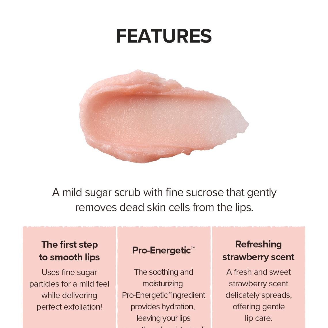 Ce gommage doux pour les lèvres, à la fraise et au saccharose, élimine délicatement les cellules mortes.