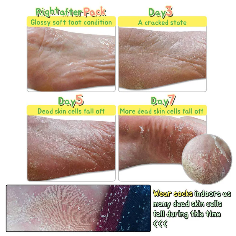 Mode d’emploi: Séparez le masque pour les pieds en suivant la ligne pointillée ou à l’aide de ciseaux. Enfilez les chaussettes-masques sur les pieds propres et laissez poser 45 à 60 minutes. Retirez ensuite le masque et rincez vos pieds à l’eau tiède. Au bout de sept jours, les peaux mortes commenceront à se détacher naturellement pour révéler des pieds lisses et doux.